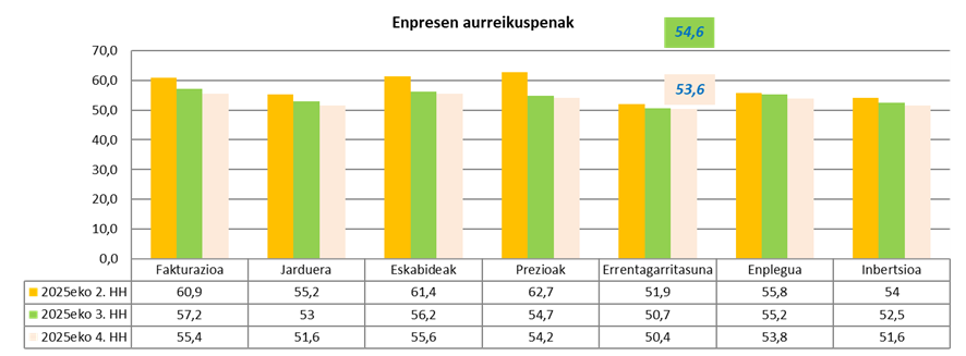 Konfiantza-indizea 53,6an kokatu da. Hau da, aurreko hiruhilekokoa baino txikixeagoa (54,6koa izan baitzen). Beraz, enpresek ikuspegi baikorra dute ekonomiaren bilakaerari buruz, 2025eko laugarren hiruhilekoari begira. Indizearen balioa 50etik gorakoa izateak jarduera hedatzen ari dela adierazten du. Gainera, balioa handiagoa da eurogunean lortutako baino (51,2ko datua lortu zen irailean), eta Estatuan lortutakoaren antzekoa (53,8ko datua, irailean).